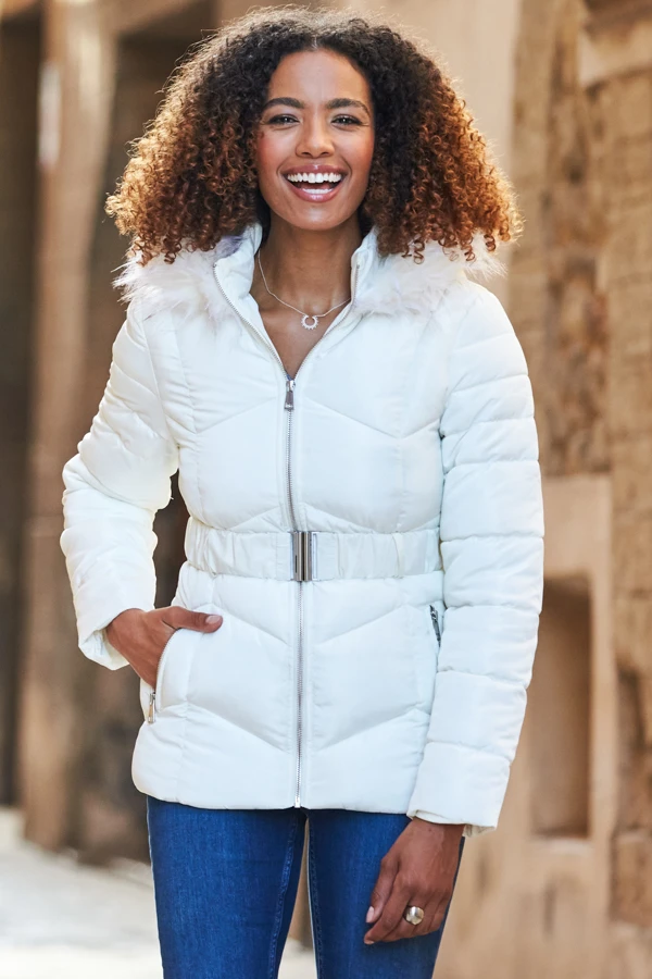 - Plush faux fur hood to keep out the chill